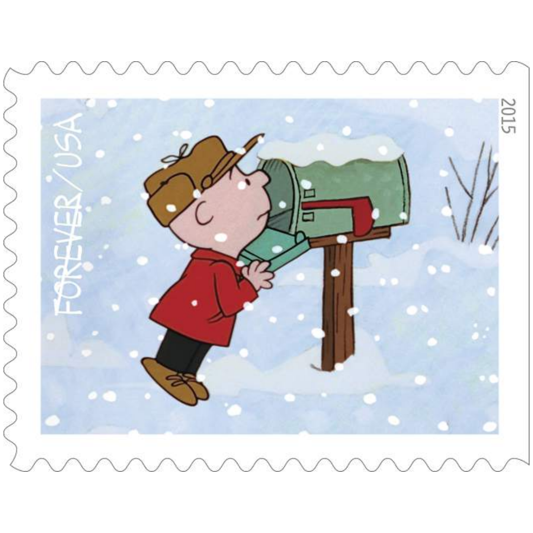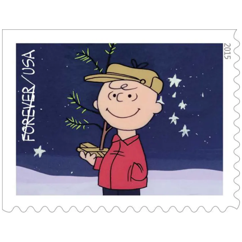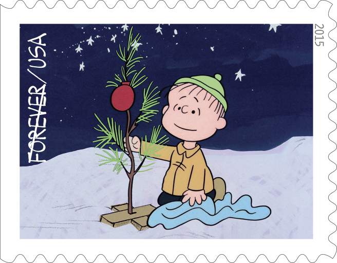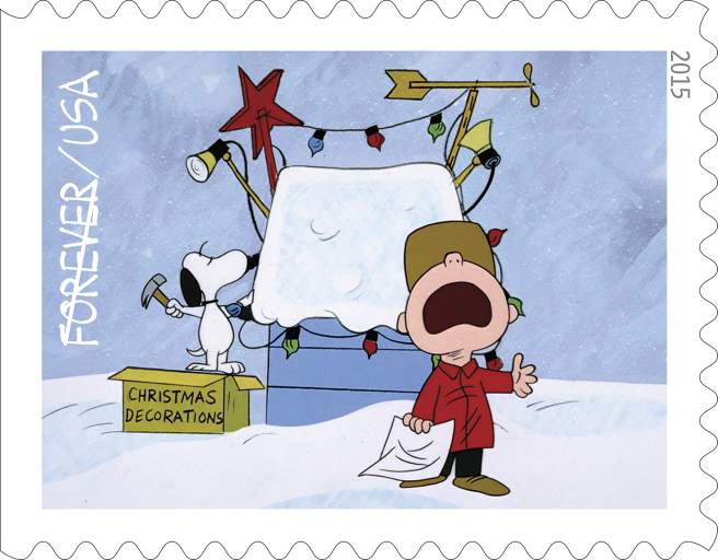 In 2015, the U.S. Postal Service celebrates the holiday season with 10 new Forever stamps featuring still frames from A Charlie Brown Christmas, the first animated special starring characters from Charles Schulz’s beloved comic strip, Peanuts.